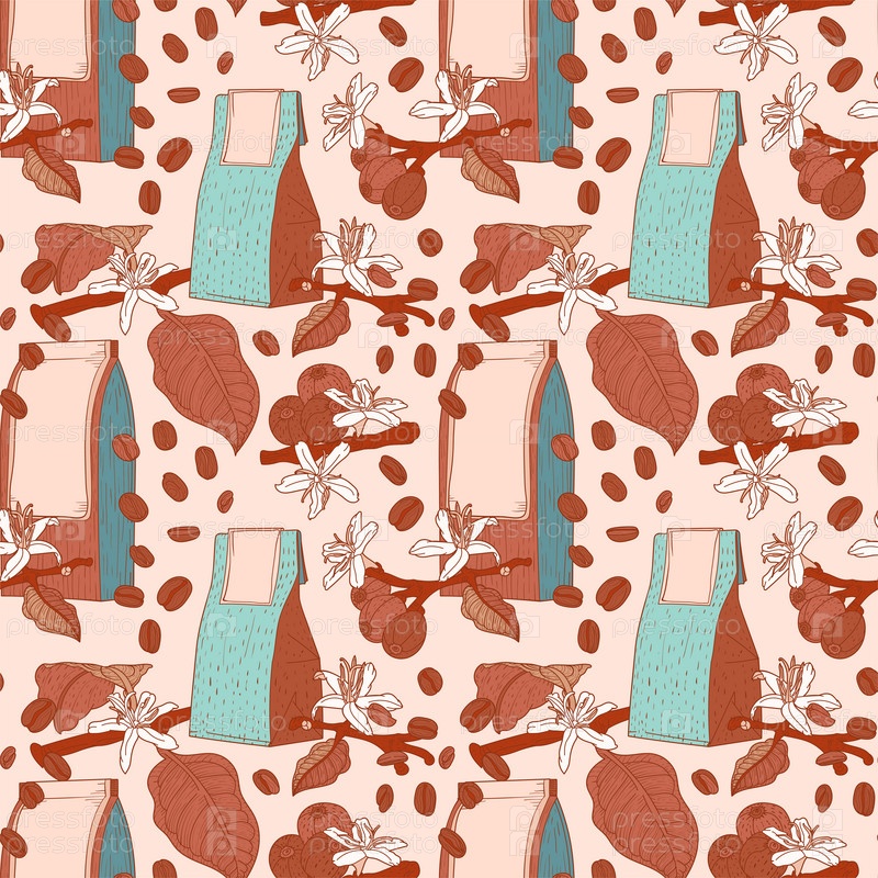 Шоколадные и мятные цвета бесшовный узор с кофейными пакетами, цветами и ветвями