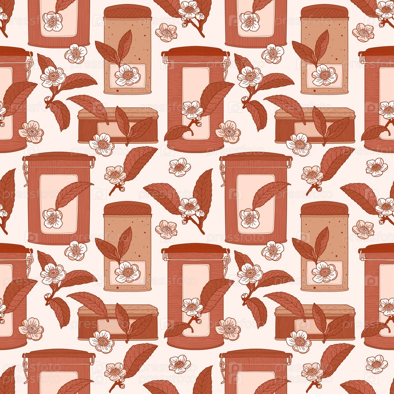 Чай коричневый бесшовный узор с коробками, листьями и цветами