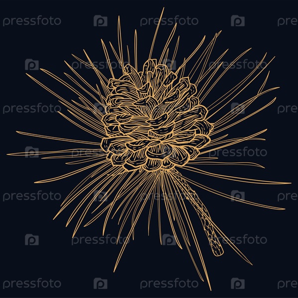 Винтажная линия искусства еловая ветка с золотым конусом