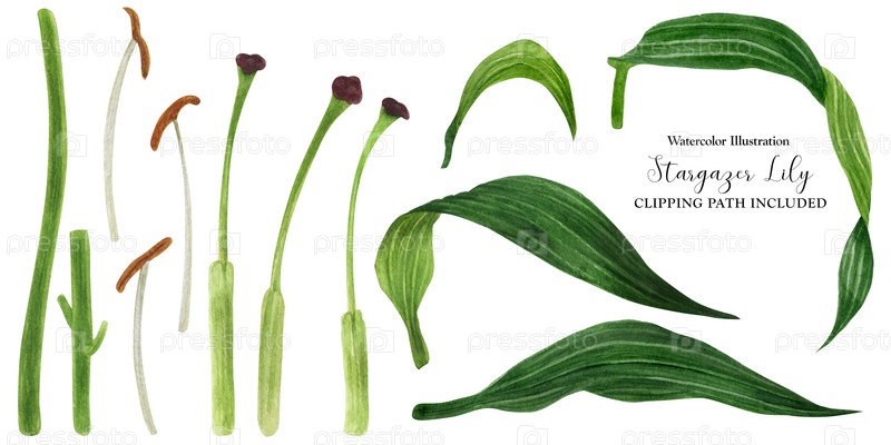 Тычинка и листья лилии, акварель с вырезкой