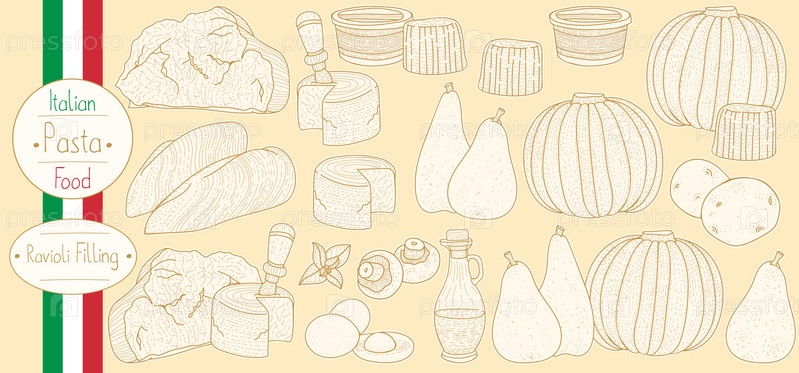 Основные ингредиенты для начинки макарон для приготовления итальянской кухни Равиоли, рисование иллюстраций в винтажном стиле
