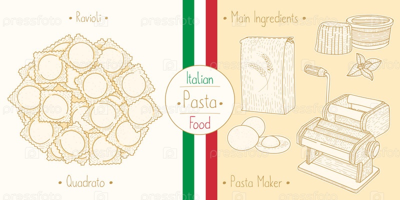 Итальянская пищевая паста с начинкой Равиоли Квадрато, рисунок иллюстрации в винтажном стиле