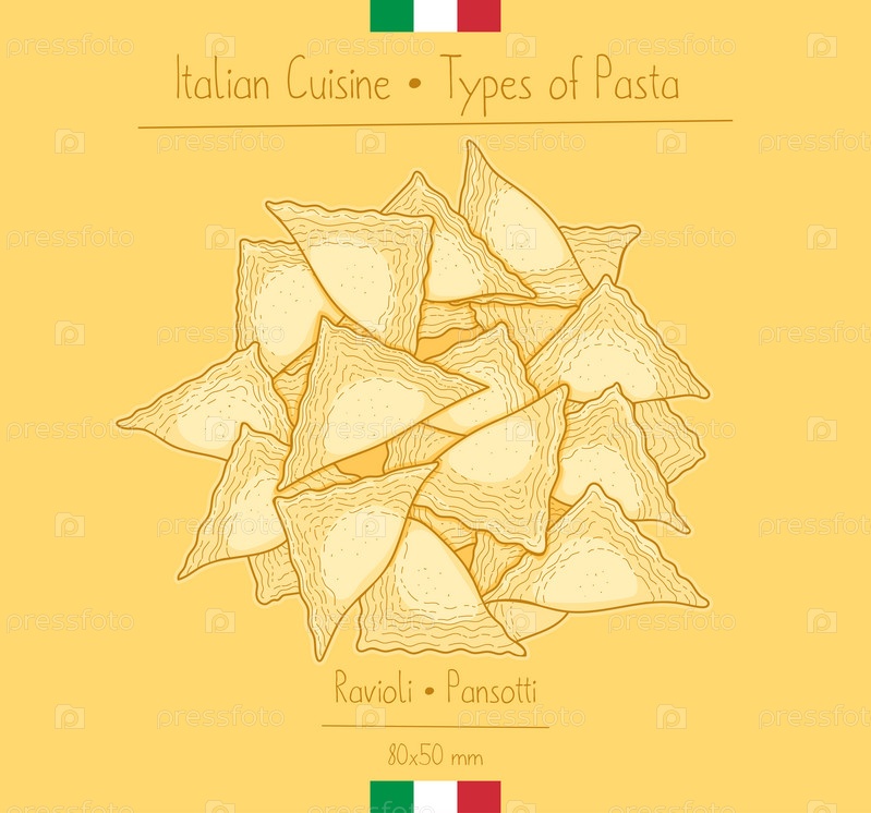 Итальянская еда треугольной формы Равиоли Паста, также известная как Пансотти, эскиз иллюстрации в винтажном стиле