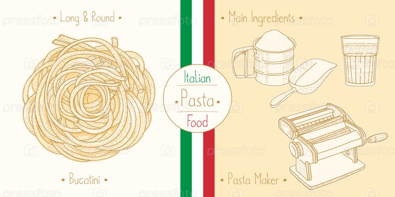 Приготовление итальянской еды Паста Букатини, похожая на спагетти, ингредиенты и оборудование