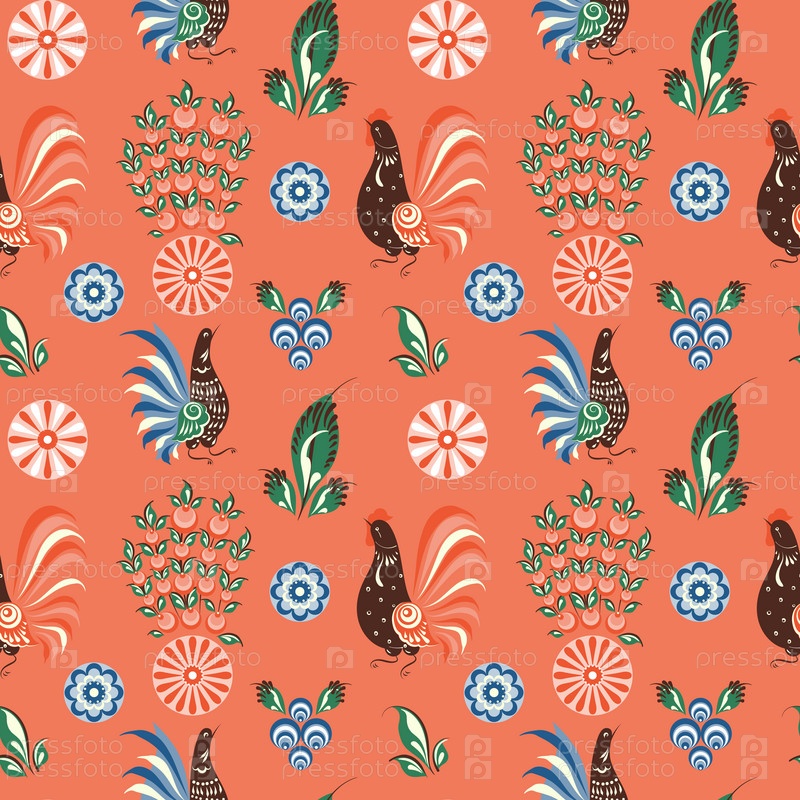 Русский народный бесшовный узор с цыплятами и петушками на красном поле