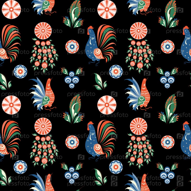 Русский народный бесшовный узор с цыплятами и петушками на черном поле