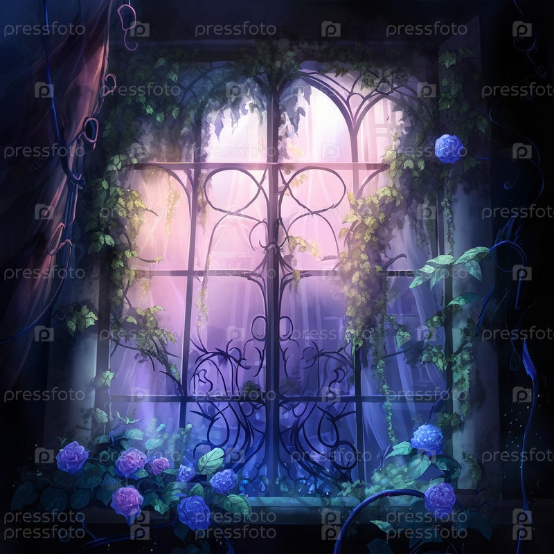 Старое окно, заросшее виноградной лозой, в стиле аниме