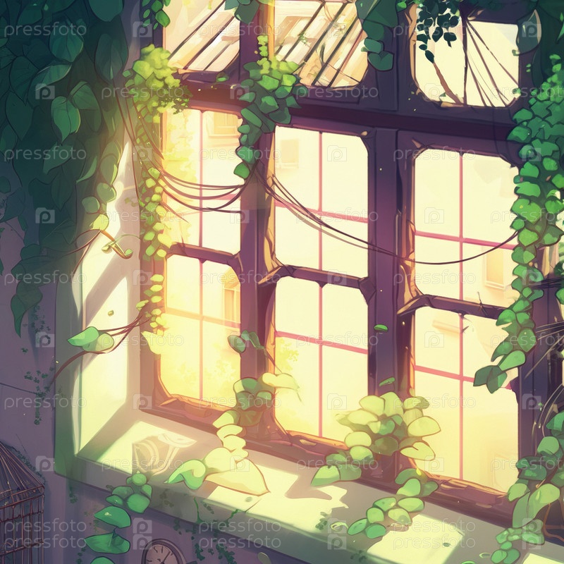 Старое окно, заросшее виноградной лозой, в стиле аниме