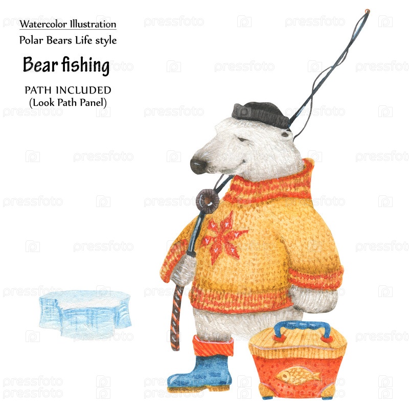 Симпатичная акварельная иллюстрация Белый медведь на зимней рыбалке. Включен изолированный контур обрезки