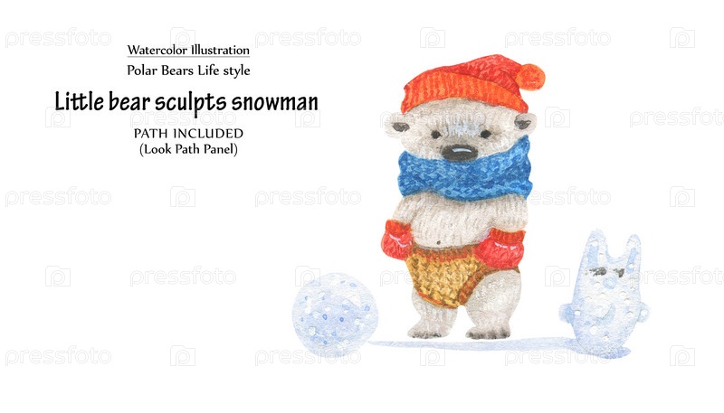 Симпатичная акварельная иллюстрацияМаленький медвежонок лепит снеговика. Включен изолированный контур обрезки