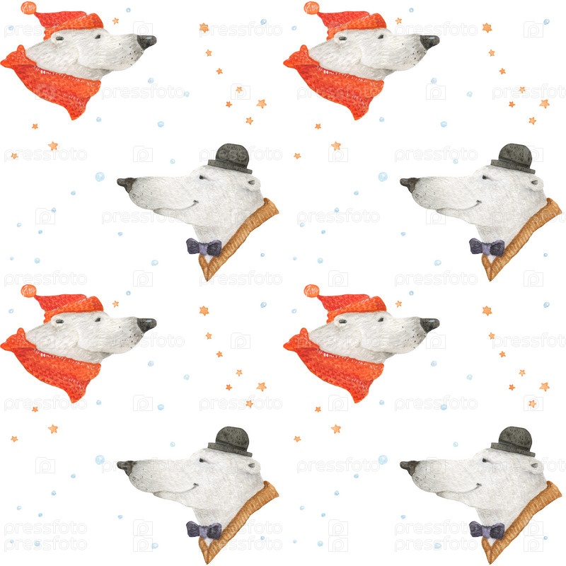 Зимние забавы белого медведя. Портреты арктических медведей. Акварельные бесшовные узоры для текстиля, оберточной бумаги и любого плиточного дизайна. Белый фон, контур обрезки не включен