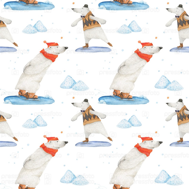 Зимние забавы белого медведя. Арктические медведи катаются на коньках. Акварельные бесшовные узоры для текстиля, оберточной бумаги и любого плиточного дизайна. Белый фон, контур обрезки не включен