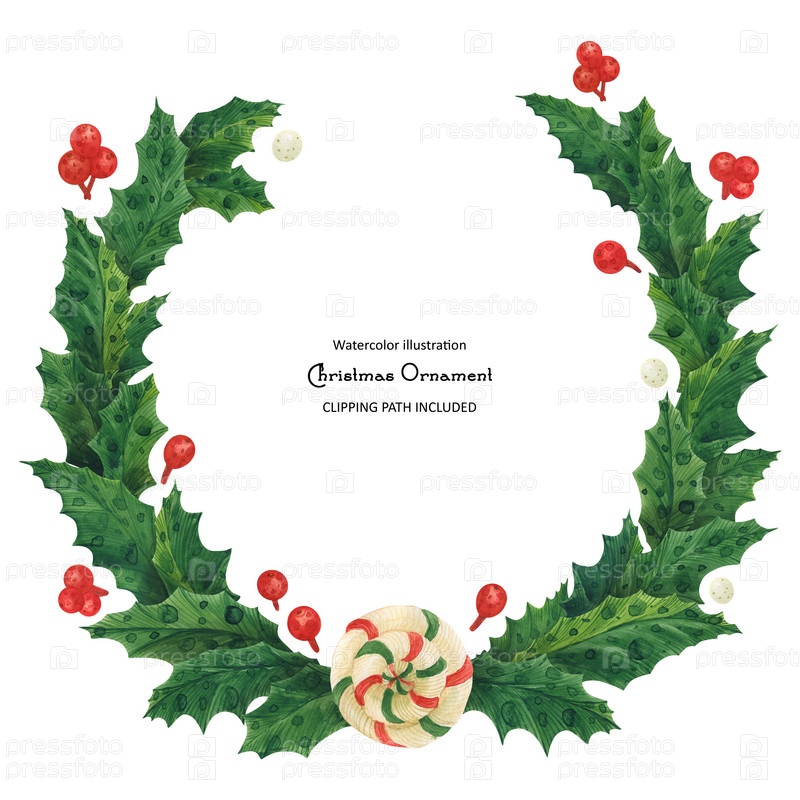Рождественский венок из падуба с леденцом, акварельная иллюстрация