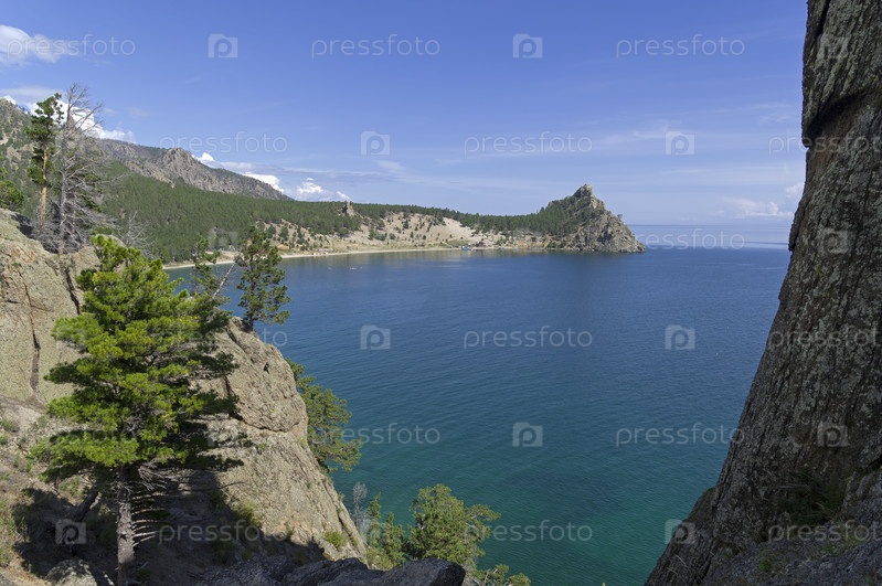 Вид на бухпу Песчаная и на Большой Колокольный Мыс с прибрежной скалы. Большая Байкальская Тропа, озеро Байкал. Иркутская область, Россия. Август