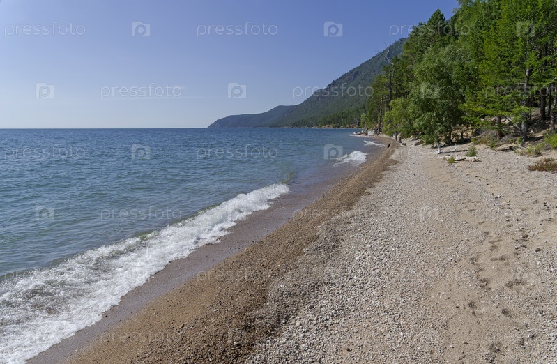 Песчаный пляж в маленькой бухте. Большая Байкальская тропа. Озеро Байкал. Иркутская область, Россия. Август