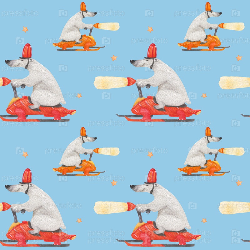 Движение по скоростной трассе белого медведя. Акварельные бесшовные узоры для текстиля, оберточной бумаги и любого плиточного дизайна. Синий фон, контур обрезки не включен