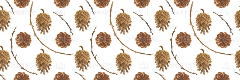 Ботаническая акварель. Шишки и ветки. Деревянный бесшовный узор для рождественского текстиля и веб-дизайна
