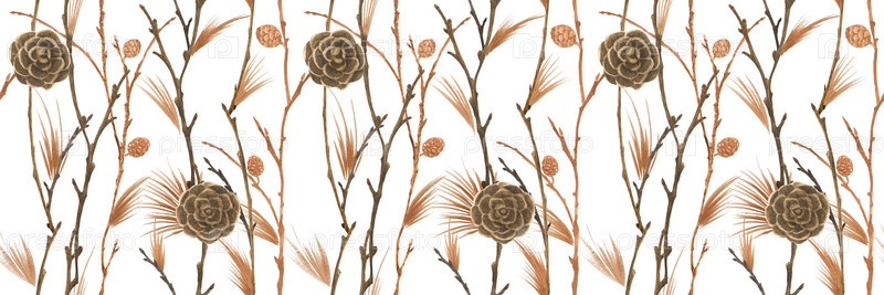 Ботаническая акварель. Шишки и ветки. Деревянный бесшовный узор для рождественского текстиля и веб-дизайна