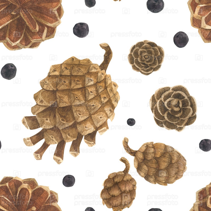 Сосновые шишки на белом снежном поле, ботанический акварельный бесшовный узор