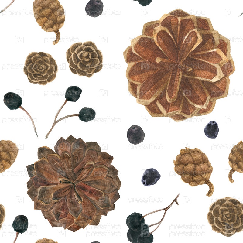 Сосновые шишки и ягоды аронии на белом снежном поле, ботанический акварельный бесшовный узор