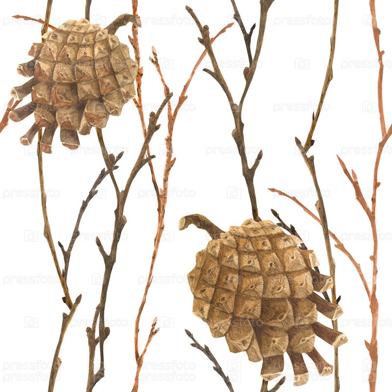 Ботаническая акварель. Шишки и ветки. Дикая природа леса бесшовный узор для рождественского дизайна, включая путь