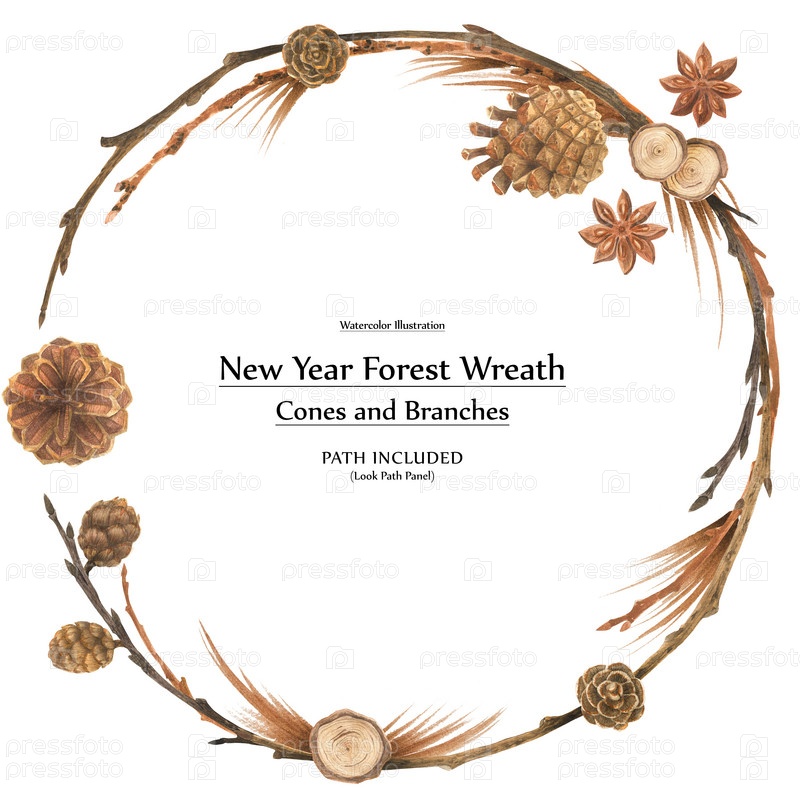 Новогодний дизайн акварелью. Венок из шишек и ветвей. изолированный, путь включен