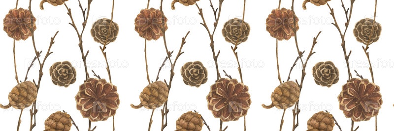 Ботаническая акварель. Шишки и ветки. Деревянный бесшовный узор для рождественского текстиля и веб-дизайна