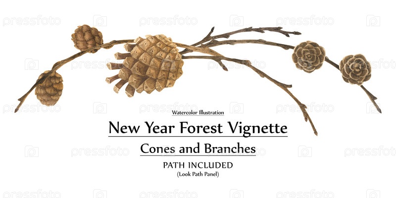 Новогодний дизайн акварелью. Шишки и ветки лесной виньетки. Изолированный, путь включен