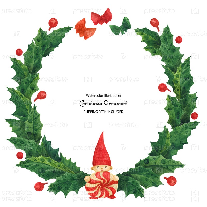 Рождественский венок из падуба с гномом, акварельная иллюстрация
