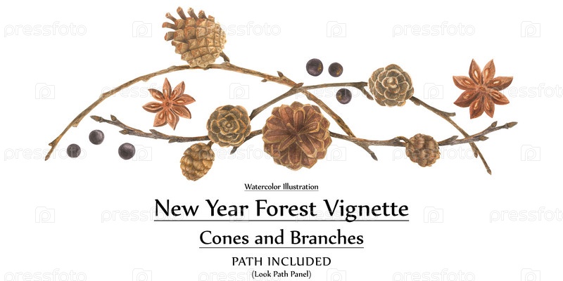 Новогодний дизайн акварелью. Шишки и ветки лесной виньетки. Изолированный, путь включен