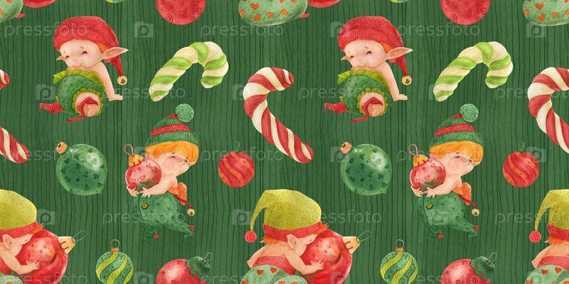 Рождественский зеленый бесшовный узор, маленькие эльфы со стеклянными безделушками и леденцами