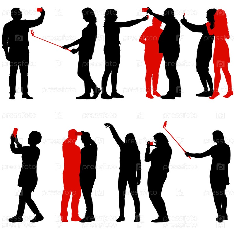 Установите силуэты мужчины и женщины, делающих селфи со смартфоном на белом фоне