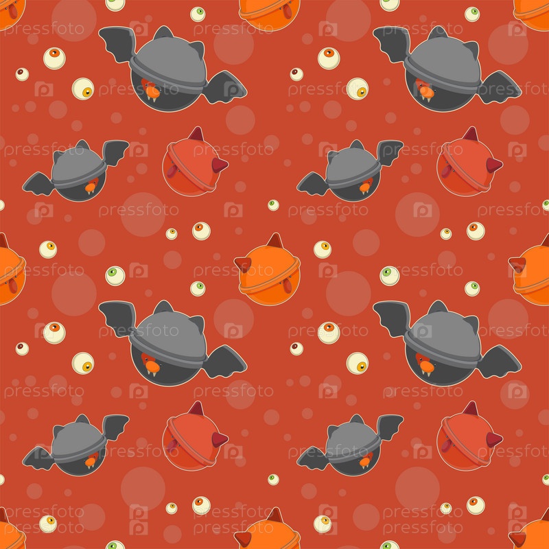 Ужасные конфеты-леденцы на Хэллоуин. Бесшовный узор в стиле модного поп-арта, оранжевый фон