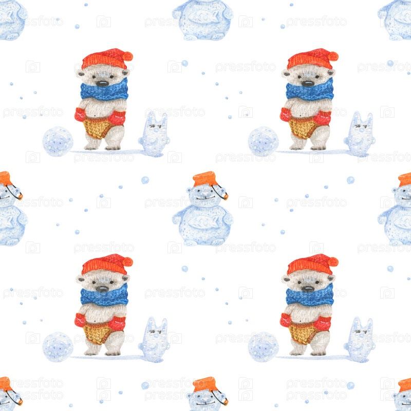 Маленький белый медвежонок лепит снеговика. Акварельные бесшовные узоры для текстиля, оберточной бумаги и любого плиточного дизайна. Белый фон, контур обрезки не включен