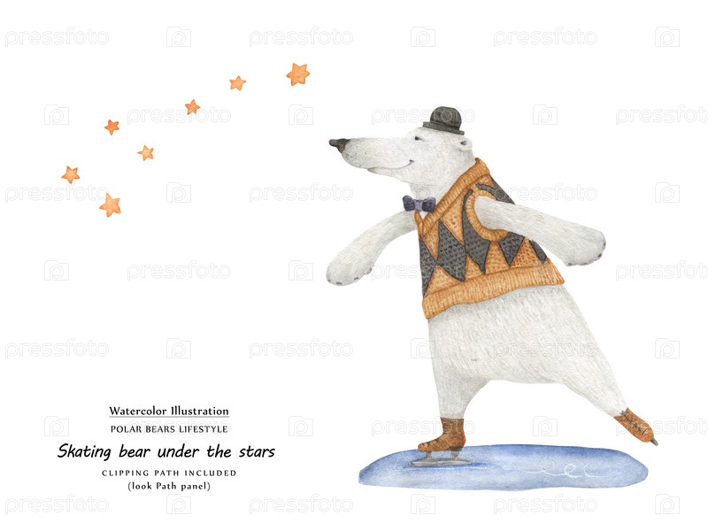 Симпатичная акварельная иллюстрация Медвежий скейт под звездами Малой Медведицы. Включен изолированный контур обрезки