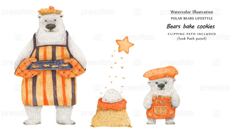 Симпатичные акварельные иллюстрации Отец и сын медведи пекут сахарное печенье. Включен изолированный контур обрезки