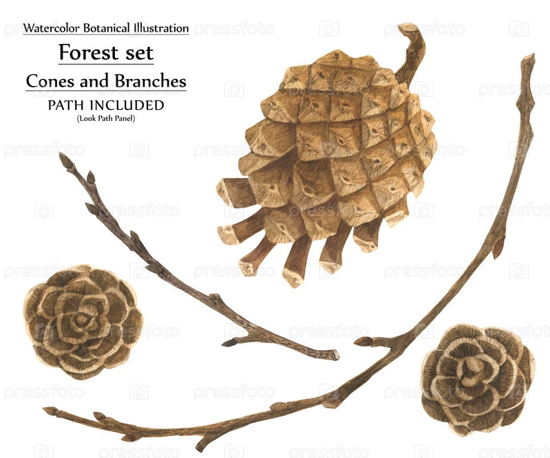 Ботаническая акварель. Шишки и ветки. Набор для рождественского дизайна, в комплект входит дорожка