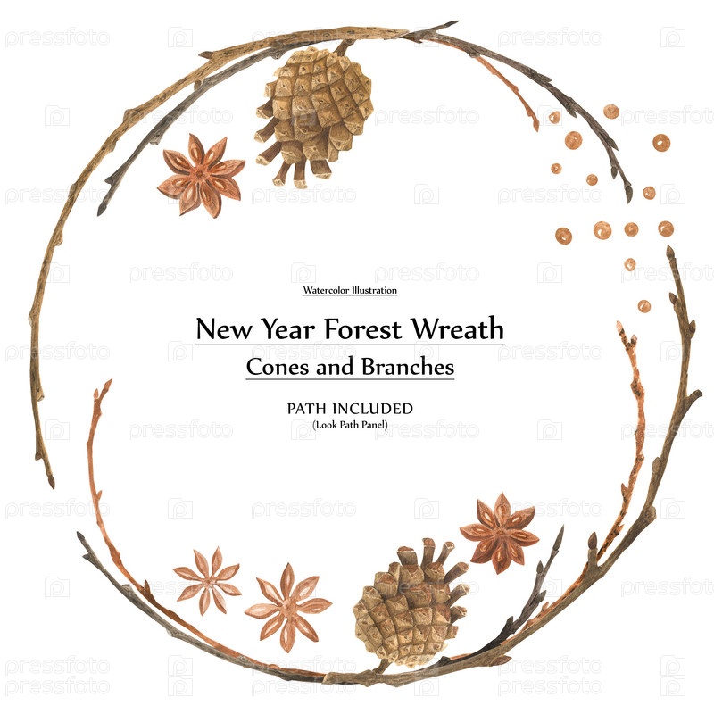 Новогодний дизайн акварелью. Венок из шишек и ветвей. изолированный, путь включен