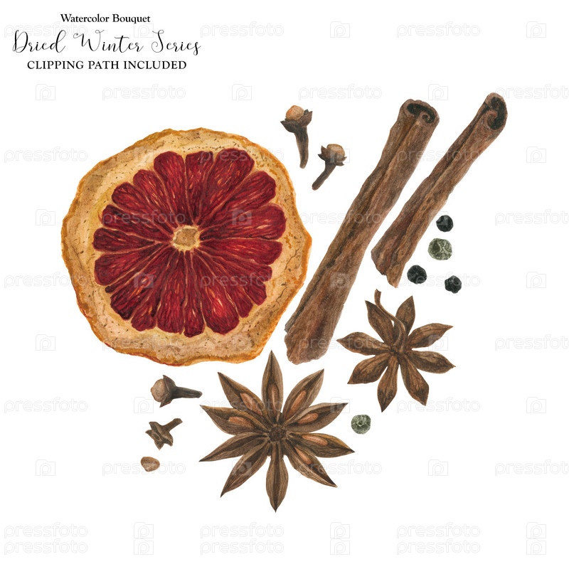Новогодний букет для зимнего пряного вина, акварель с вырезкой