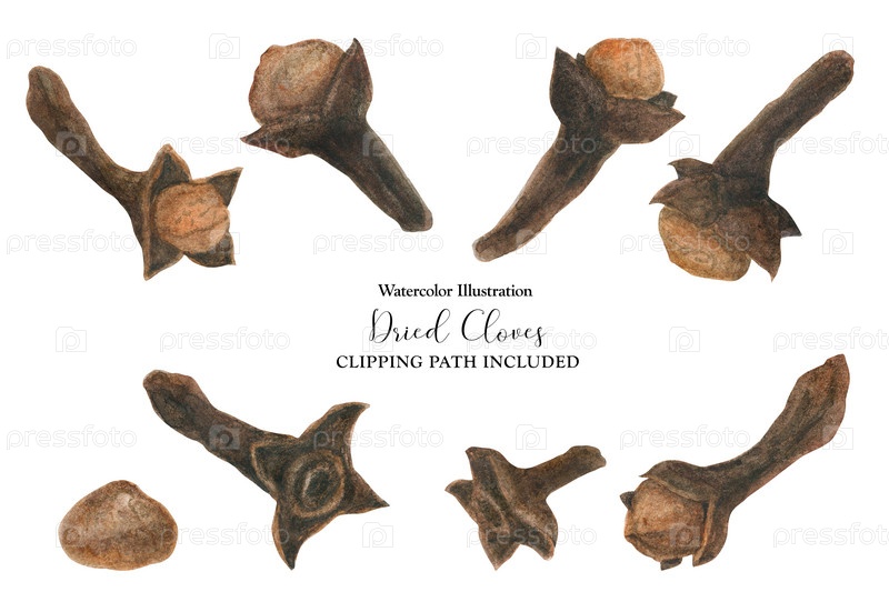 Гвоздика. Сушеные бутоны, акварельная ботаническая иллюстрация, изолированный и вырезаемый путь