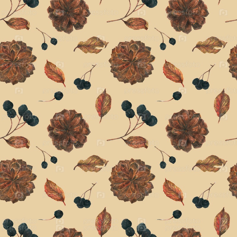 Арония и сосновые шишки на рождественский бежевый бесшовный узор
