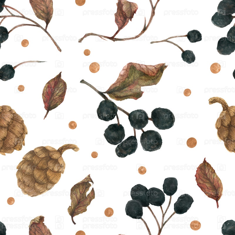Зимние темные ягоды на белом снежном поле, ботаническая акварель бесшовный узор
