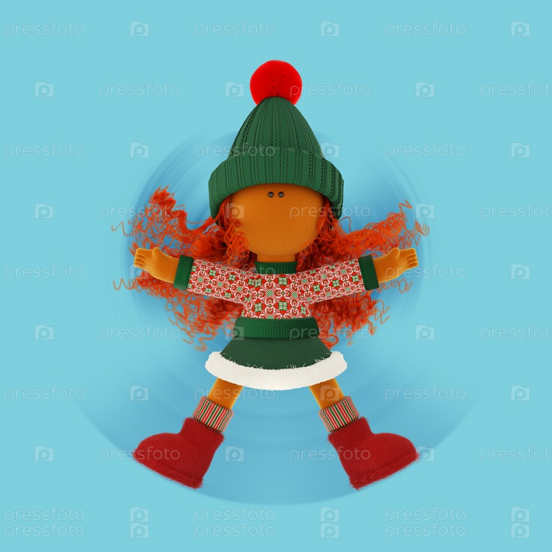 Симпатичная кудрявая рыжеволосая тряпичная кукла делает снежного ангела, синий фон