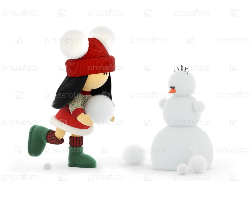 Милая тряпичная кукла в вязаном рождественском свитере лепит новогоднего снеговика