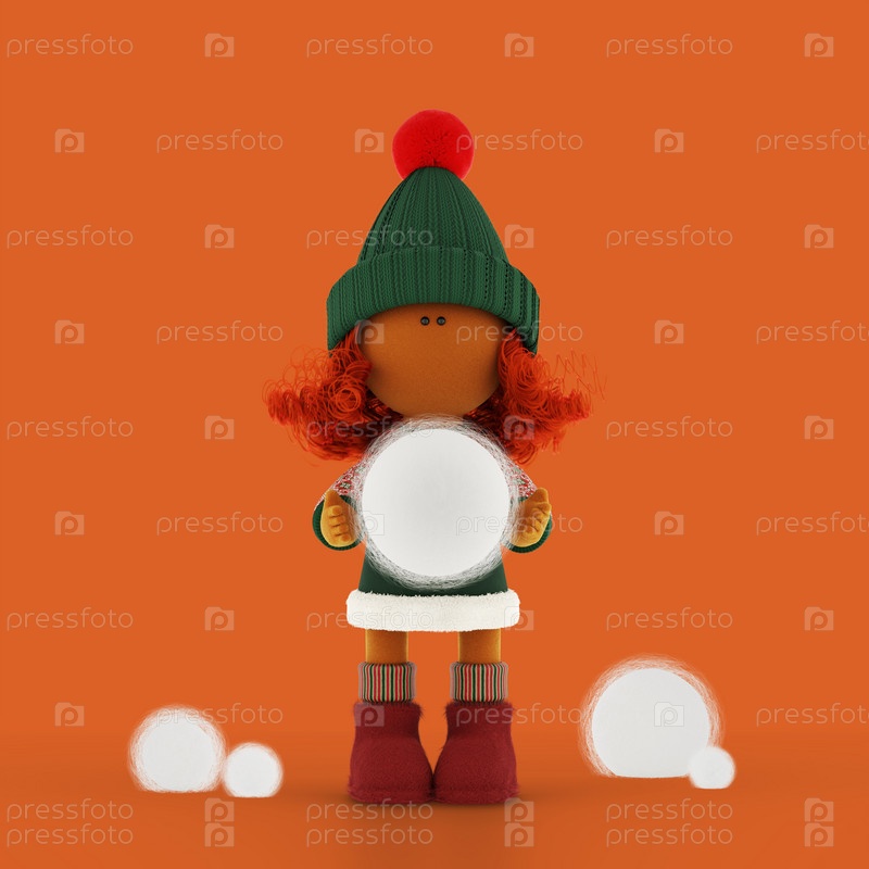Милая кудрявая рыжеволосая тряпичная кукла несет снежок, оранжевый