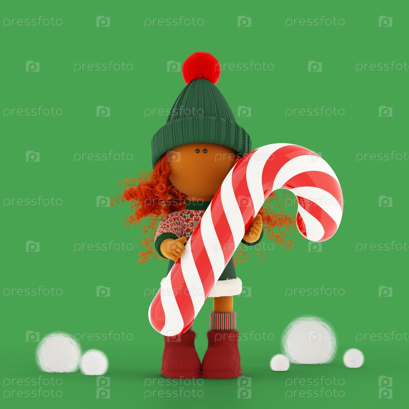 Милая кудрявая рыжеволосая тканевая кукла несет в подарок большую рождественскую красно-белую конфету. Молодая загоревшаяся кукла в новогодном вязанном свитере. 3D рендеринг изображений для зимних каникул. Зеленый фон