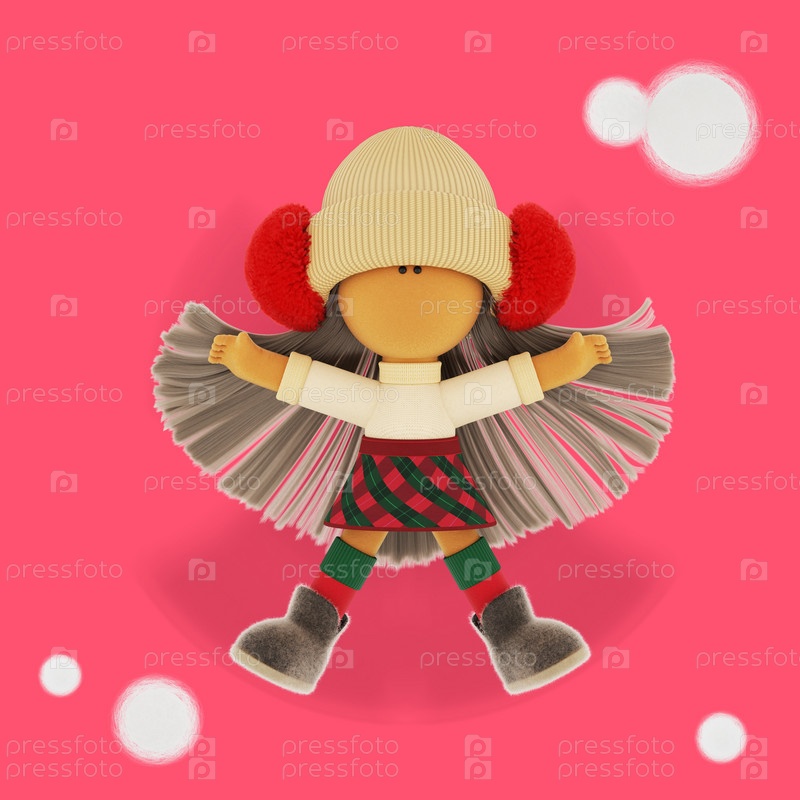 Рождественская тряпичная блондинка-кукла в образе снежного ангела. Молодая текстильная кукла в кремовом вязанном свитере и клетчатой юбке в шотландской клетке. 3D-рендеринговые иллюстрации к зимним новогодним праздникам. розовый