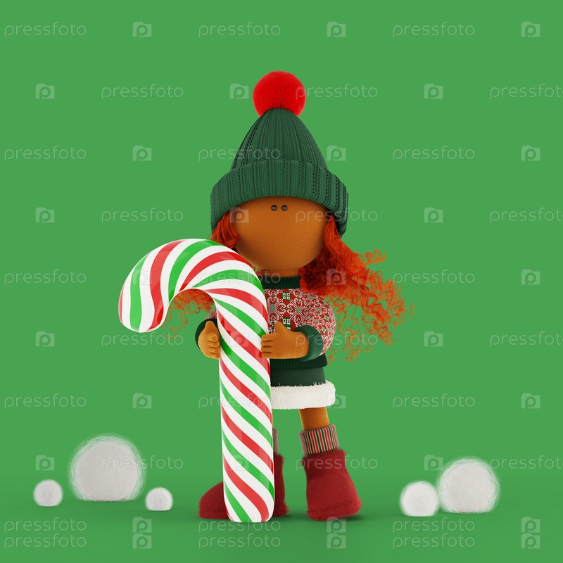 Милая кудрявая рыжая тканеная кукла с большой рождественской красно-зелено-белой конфетой. Молодая загоревшаяся кукла в новогодном вязанном свитере. 3D-рендеринговые картинки для зимних каникул. Зеленый