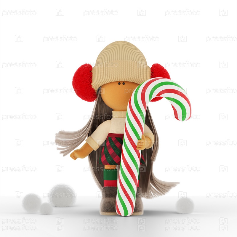 Рождественская блондинка тряпичная кукла с полосатыми красно-зелено-белыми конфетами. Молодая текстильная кукла в кремовом вязанном свитере и клетчатой юбке в шотландской клетке. 3D-рендеринг к зимним новогодним праздникам. Отравленный контур