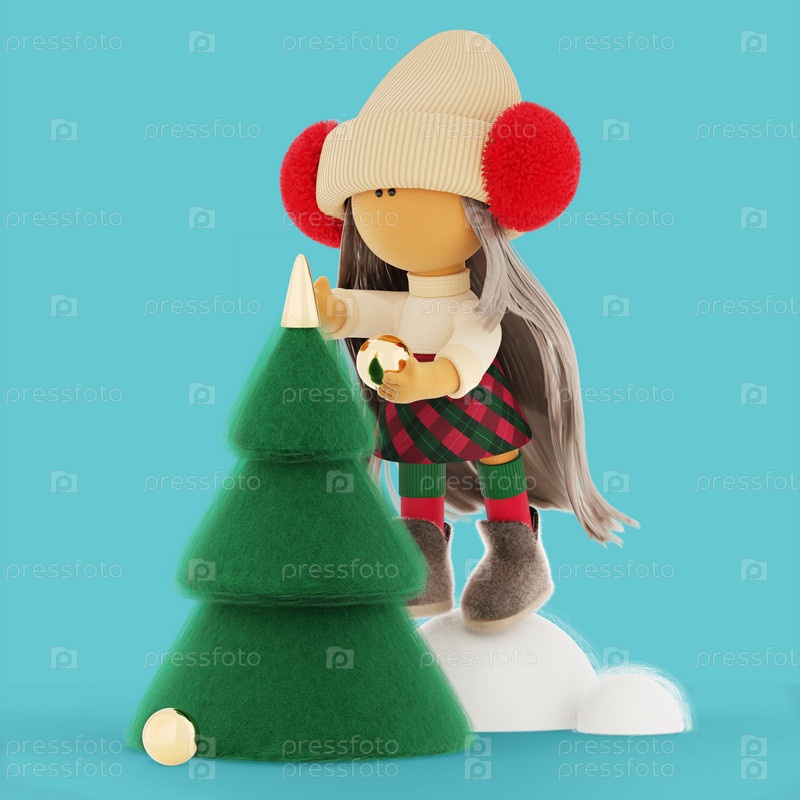 Рождественская тряпичная кукла-блондинка украшает елку золотым шаром. Голубое небо
